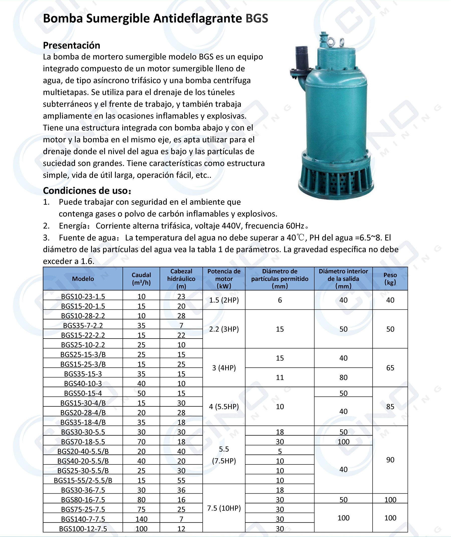 Bomba Sumergible Antideflagrante BQS – Ideal para el drenaje en túneles subterráneos y frentes de trabajo. Su diseño integrado con motor sumergible y bomba multietapas permite operar en ambientes inflamables y con partículas de suciedad grandes. Eficiencia, durabilidad y fácil operación.